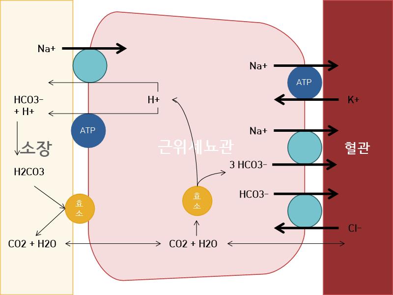 : 아세타졸아마이드는 ‘탄산무수화효소’를 억제하는 작용을 합니다. 이 효소는 적혈구나 다른 체내 조직에서 발견되는데, H2CO3 ⇌ H2O + CO2 반응을 촉매하는 효소입니다. ‘탄산무수화효소’는 근위세뇨관에 존재하며, 중탄산염, 나트륨, 염소의 재흡수를 일으키게 됩니다. 또한 아래 그림에서 보이듯이 칼륨은 배출하는 작용을 일으키게 됩니다. 또한 H2CO3라는 물질은 H+와 HCO3-라는 물질로 나뉘게 되는데, 이 중 H2CO3라는 물질은 중성을 띄어 세뇨관이라는 소변이 지나는 통로를 마음껏 이동할 수 있으나 H+라는 물질은 +전하를 가지고 있어서 세뇨관이라는 통로에 갇히게 됩니다. 이런 과정을 통해 우리의 소변은 산성을 띄게 됩니다. 추가로 아래의 그림에서와 같이 나트륨이온 또한 탄산무수화효소에 의해 흡수되게 됩니다.