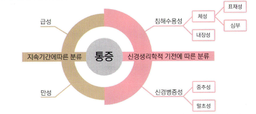 신경생리학적 기전에 따라 침해수용성 통증(nociceptive pain)과 신경병증성 통증(neuropathic pain)으로 구분